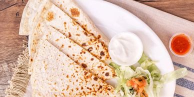 Rice, beans, salad and guacamole with tortillas. (corn or flour)